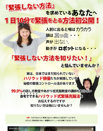 | メッセージ | 期間中はアフィリエイト報酬 38%⇒50%の特別報酬!ハリウッド俳優たちが使っている緊張克服法を具体的な映像と解説でお伝えするスペシャル教材が登場!人前で話しをしたり、発表することが多くなる新年度。緊張をいかにコントロールするかがとても大事になってきます。DVD教材なのでわかりやすく実践しやすいことで大変好評をいただいています。特別報酬期間は 3月15日(水)までですので、この間に莫大な報酬を手に入れてください。 |